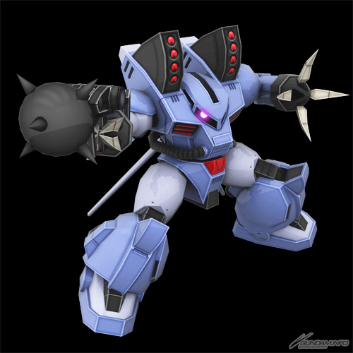 「ガッシャ」は、リック・ドムと連携した強襲作戦を想定して開発された機体で、「山越えハンマー」と呼ばれる障害物を超えて相手を攻撃できる質量兵器「特殊ハンマー・ガン」のほか、「コンバット・ネイル」、「4連装ミサイル・ポッド」といった多彩な実体弾兵器を搭載する。