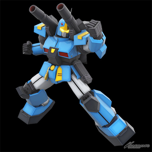 「ガンキャノン重装型」は、単独での作戦遂行をも可能とする目的で開発された機体で、射撃時の反動軽減、給弾能力の向上による攻撃力強化に加え、スラスター推力の増強など重装備に耐えられる機動性能の向上が図られている。