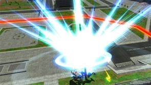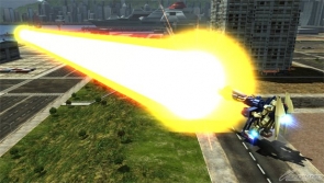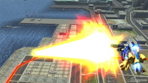 ▲飛行形態時のサブ射撃では、相手の攻撃を避けながら連続でビームを撃つ。