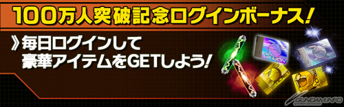 キャンペーンのうち「100万人突破!記念ログインボーナス!」は、10月1日(火)から8日(火)の期間中に、ゲームにログインすることで、自分用行動EN回復パック、自分用指揮力回復パック、ゴールドガシャチケット、ゴールドパイロットガシャチケット、プレミアムガシャチケット、ミリオンガシャチケットのいずれかが1日1回プレゼントされるというもの。
