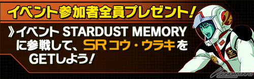 「STARDUST MEMORY」、「総力戦!ノイエ・ジール」のどちらかのイベントに参加するだけで、「【SR】コウ・ウラキ」が1体プレゼントされる。