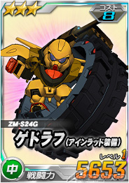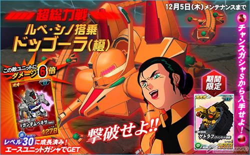 「ルペ・シノ搭乗ドッゴーラ(橙)」を倒した際に引くことができるチャンスガシャSには、「ゲドラフ(アインラッド装備)」を獲得できるチャンスがあるほか、エー スユニットガシャには「ルペ・シノ搭乗ドッゴーラ(橙)」に対し6倍の攻撃力を発揮する「Vガンダムヘキサ(MS)」が追加される。