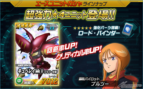 エースユニットガシャには、同じく本日より「★4 キュベレイMk-II(プルツー仕様)」が追加された。「★4 キュベレイMk-II(プルツー仕様)」は、強化パーツ「ロード・バインダー」を搭載した超強力な機体となっているので、ぜひとも手に入れよう。