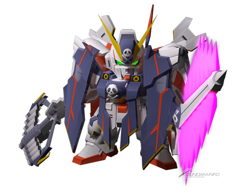 『機動戦士クロスボーン・ガンダム 鋼鉄の7人』に登場するMS。武器2「ピーコックスマッシャー」は複数のビームを扇状に放つ射撃武器で、相手に対し至近距離で使用することで複数ヒットによる大ダメージが狙える。また、本機はRキーによるパージ変形が可能で、パージ後はブースター量の大幅増加があるほか、耐ビームシールドを持つようになる。パージ変形を的確に使えるタイミングの見極めが強さを引き出すカギとなる。