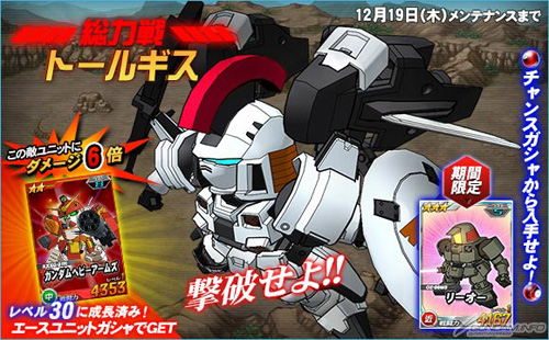 総力戦には本日から12月19日(木)までの期間限定で「トールギス」が登場し、期間中に任務を実行すると、まれにエンカウントすることがある。