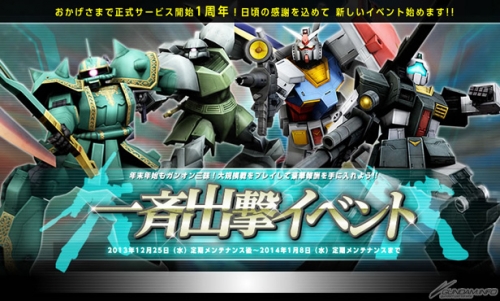 バンダイナムコオンラインより好評サービス中のWindows専用オンラインゲーム「機動戦士ガンダムオンライン」では、本日12月25日(水)より正式サービス開始1周年を記念した「一斉出撃イベント」がスタートした。