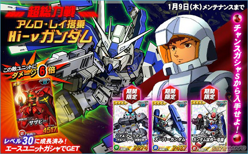 「アムロ搭乗Hi-νガンダム」を倒した際に引くことができるチャンスガシャSには、「★4 FAアレックス(チョバム・アーマー装備仕様)」、「★4 スーパーガンダム」、「★4 ガンダム試作一号機」を獲得できるチャンスがあるほか、エースユニットガシャには「アムロ搭乗Hi-νガンダム」に対し6倍の攻撃力を発揮する「★2 サザビー」が追加される。