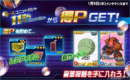 さらに、本日より2014年1月9日(木)までの期間限定で「得Pイベント」もスタート。本イベントは「エースユニットガシャ」や「11連エースユニットガシャ」を引くことでポイント(得P)を獲得することができ、そのポイントの合計値に応じた報酬が得られるというもの。