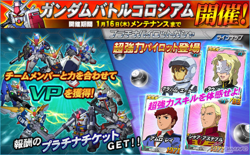 さらに、同じく本日から1月16日(木)までの期間限定で「ガンダムバトルコロシアム」、および「獲得PPアップキャンペーン」がスタートした。