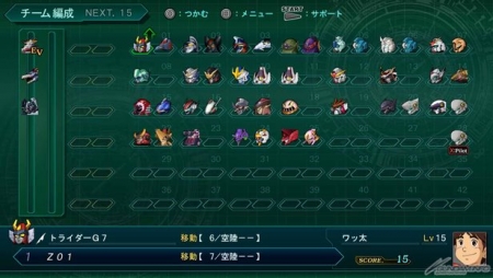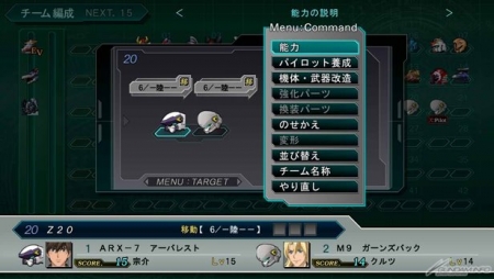 ▲チーム編成画面では、パイロット養成や機体改造、強化パーツの着脱などの各種操作を行うこともできる。