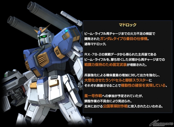 ガンダムタイプ6番目の仕様機として開発された「マドロック」は、ビーム・ライフルと増設された固定武装による高火力を保持しながら、大型化されたランドセルと脚部スラスターで高い機動性の確保を実現したスペシャルな機体となっているので、ぜひとも手に入れよう。
