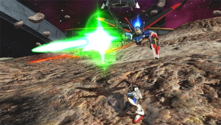 遠距離ではブラスト、中距離ではフォース、近距離ではソードと、戦況に応じて換装していくことが重要。バーストアタックではデスティニーガンダムが援護に駆けつけ、敵機に突撃を仕掛ける。うまく連携して敵機を撃破しよう。