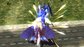 ▲上半身と下半身を分離させて攻撃するフォースインパルス形態のサブ射撃。敵の攻撃を回避しながらビームを撃つことができるぞ。