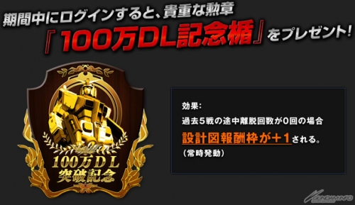 期間中にログインすると「100万DL記念楯」が贈呈される。