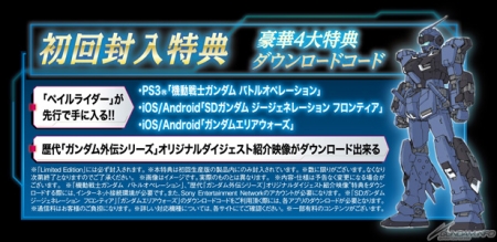 本作には初回封入特典として、好評配信中のPS3「機動戦士ガンダム バトルオペレーション」で「ペイルライダー」が先行で入手できるプロダクトコードをはじめとした、豪華4大特典ダウンロードコードが付属する。