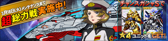 「タリア搭乗ミネルバ」を倒した際に引くことができるチャンスガシャSには、★4ユニットを獲得できるチャンスがあるほか、エースユニットガシャには「タリア搭乗ミネルバ」に対し、3倍の攻撃力を発揮する「★2 ガイアガンダム(MS)」が追加される。