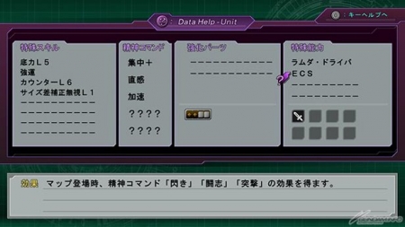 なお、「闘志」は「一度だけ攻撃が確実にクリティカルになる」、「突撃」は「一度だけマップ兵器を除く全ての武器が移動後に使用可能となる」効果を持つ。