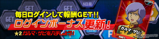 ゲームへログインすると、1日1回報酬がもらえるログインボーナスの報酬内容が更新され、新たにパイロットカード「★2 ガルマ・ザビ」が追加された。ログインボーナスは期間中20回まで獲得可能で、21回以上ログインしてもそれ以降発生しないので注意しよう。キャンペーンは4月15日(火)まで。