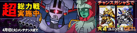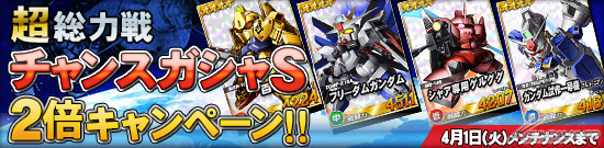 キャンペーンは超総力戦の「チャンスガシャS」、および「チャンスガシャ」を引ける回数が、期間中は通常の2倍となるというもの。開催期間は4月1日(火)まで。