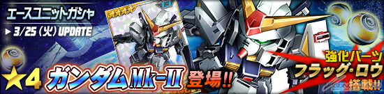 本日のアップデートでエースユニットガシャに「★4 ガンダムMk-II」が追加された。同機は強化パーツ「フラッグ・ロウ」を搭載した強力な機体となっているので、ぜひとも手に入れよう。