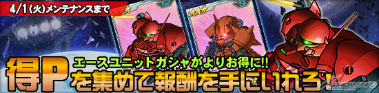 同じく本日より4月1日(火)までの期間限定で開催される「得Pイベント」は、「エースユニットガシャ」や「11連エースユニットガシャ」を引くと獲得できるポイント(得P)の合計値に応じて、様々な報酬が得られるというもの。「得P」を貯めて「ガーベラ・テトラ」や「ザクII(ガルマ・ザビ専用機)」などの豪華報酬を手に入れよう。