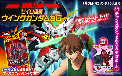 超総力戦には本日から4月3日(木)までの期間限定で「ヒイロ搭乗ウイングガンダムゼロ」が登場し、期間中に任務を実行すると、まれにエンカウントすることがある。