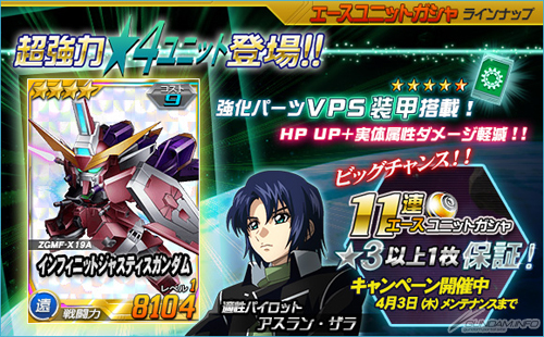 エースユニットガシャには、同じく本日より「★4 インフィニットジャスティスガンダム」、「★3 アストレイレッドフレームフライトユニット」、「★3 コア・ファイターII フルバーニアン」の3機が追加された。「★4 インフィニットジャスティスガンダム」は、強化パーツ「VPS装甲」を搭載する強力なユニットとなっているので、ぜひともゲットしよう。