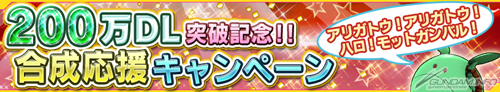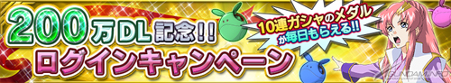 200万DL突破記念「ログインキャンペーン」では、期間中にログインすると「200万DL記念10連ガシャメダル」が毎日1枚プレゼントされ、「合成応援キャンペーン」では、期間中に機体・パイロットのスキル強化を行った際、獲得できる基礎経験値が通常の2倍となる。