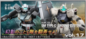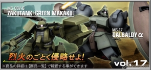「ガシャコン」はゲーム内の通貨である「GP」を消費することでプレイでき、今回新たに配信が開始された第17弾では、地球連邦軍より「ジーライン(基本フレーム)」と「ジム改(地上戦仕様)」が、ジオン公国軍より「ガルバルディα」と「ザクタンク(グリーン・マカク)」などの注目機体が登場する。