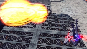 ▲ Sub-ranged fires a shot from its Beam Magnum. Firing also causes the suit's three shields to form a barrier against ranged attacks from the front.
