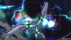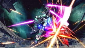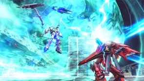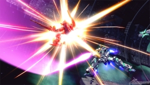 ▲ Special melee activates Psycoframe resonance, purging weapons, bathing nearby enemies in a dazzling light, and firing a burst Beam Gatling Gun from the dropped shield while charging in for a body check.