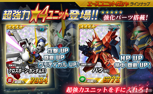 さらに、エースユニットガシャには「★4 クロスボーン・ガンダムX1」「★4 バウ(MS)」が追加されたほか、「ガンダムバトルコロシアム」と「獲得PPアップキャンペーン」も開始された。