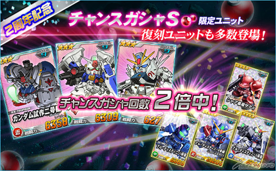 さらに、エースユニットガシャには「★3 ガンダムエピオン(MS)」、プラチナパイロットガシャには「★3 ノリス・パッカード」などが追加されたほか、2周年記念の「2週連続 得Pイベント」なども開始された。