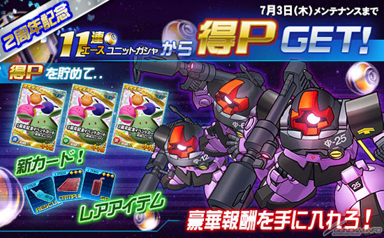 同じく本日より7月3日(木)まで、2週連続で開催される「得Pイベント」は、「エースユニットガシャ」や「11連エースユニットガシャ」を引くと獲得できるポイント(得P)の合計値に応じて、様々な報酬が得られるというもの。「得P」を貯めて「★3 黒い三連星専用ドム(ガイア機)」などの豪華報酬を手に入れよう。