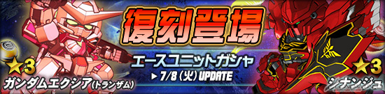 さらに、エースユニットガシャに「★3 ガンダムエクシア(トランザム)」、「★3 シナンジュ」が復刻登場する。