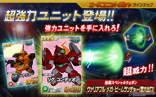 さらに本日よりエースユニットガシャに、「★3 リグ・コンティオ」、「★3 リグ・シャッコー」が登場。「★3 リグ・コンティオ」は、スペシャルウェポン「ヴァリアブル・メガ・ビームランチャー(最大出力)」を搭載する強力な機体となっているので、ぜひとも手に入れよう。また、プラチナパイロットガシャには「★3 クロノクル・アシャー」、「★3 カテジナ・ルース」が登場する。