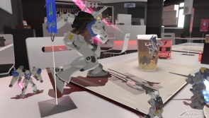 本作では、原作に登場するステージに加えて、ゲームオリジナルのジオラマステージが数多く登場する。今回公開された「ガンダムカフェステージ」は、おなじみの秋葉原店の店内を再現しており、テーブルの上で暴れ回るガンプラバトルが楽しめる。高低差を活かしてミクロな世界で戦い抜こう。