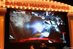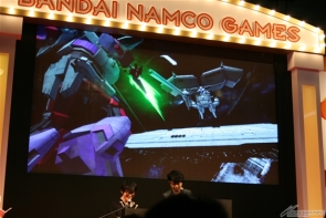 怒涛の新情報に沸き立つステージでは、続いて小西氏と阿部氏が自ら作成した機体を使用し、実際にゲームをプレイ。本作が初となる「宇宙ステージ」にて、同じく初登場となる強大な機体「ガンダム試作3号機 デンドロビウム」に挑み、多いに会場を沸かせた。