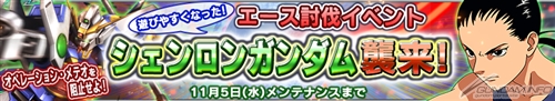 11月5日(水)メンテナンス開始までのイベント期間中、戦争および曜日ミッションのサーチポイントから、イベント限定エースが出現し、討伐して撃破ポイントを貯めることで、「HR 張五飛」、「SR シェンロンガンダム」などのイベント機体やパイロットを獲得することができる。