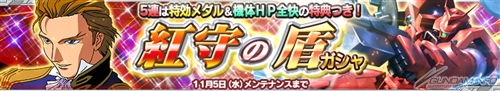 「紅守の盾ガシャ」は、エース討伐イベント「シェンロンガンダム襲来!」にて特効効果を持つ機体やパイロットがラインナップに含まれるガシャ。5連と単発の2種類が用意され、価格は5連が初回600CP、通常1,500CP。単発が初回100CP、通常300CP。