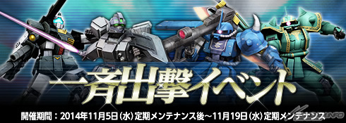 バンダイナムコオンラインより好評サービス中のWindows専用オンラインゲーム「機動戦士ガンダムオンライン」では、本日11月5日(水)より強力な機体や豪華アイテムを獲得できる「一斉出撃イベント」がスタートした。