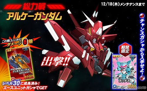 総力戦には12月18日(木)までの期間限定で「アルケーガンダム」が登場し、期間中に任務を実行すると、まれに遭遇することがある。