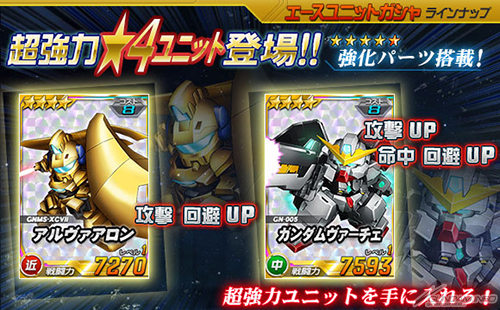 本日よりエースユニットガシャに「★4 アルヴァアロン」、「★4 ガンダムヴァーチェ」が登場。「★4 アルヴァアロン」は「GNドライヴ[T]」を、「★4 ガンダムヴァーチェ」は「GNドライヴ」を、それぞれ強化パーツに搭載した強力なユニットとなっているので、ぜひとも手に入れよう。