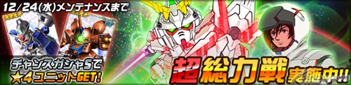 今回の超総力戦では「バナージ搭乗ユニコーンガンダム(NT-D)」が登場し、12月24日(水)までの期間中に任務を実行すると、まれに遭遇することがある。