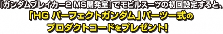 「ガンダムブレイカー2 MS開発室」でモビルスーツの初回設定をすると、「HG パーフェクトガンダム」パーツ一式のプロダクトコードを入手できる。