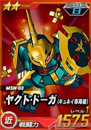 ※「★2 ヤクト・ドーガ(ギュネイ専用機)」、「★2 サザビー」と同一ユニットを強化合成に使用し強化パーツのLvを上げると、それぞれ「ロンド・ベル隊」、「アムロ搭乗 Hi-νガンダム」への攻撃力倍率が「100%」上昇します。