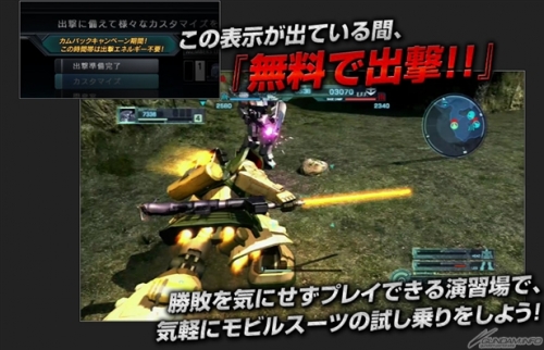 過去30日以上ログインしていないか、キャンペーン開始日以降に新しくプレイデータを作成したプレイヤーを対象に、指定の時間帯に「演習場」が無料開放される。