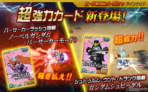 本日よりエースユニットガシャに「★3 ノーベルガンダム(バーサーカーモード)」、「★3 ガンダムシュピーゲル」などが登場。スペシャルウェポンとして、「★3 ノーベルガンダム(バーサーカーモード)」は「バーサーカーラッシュ」を、「★3 ガンダムシュピーゲル」は「シュトゥルム・ウント・ドランク」を搭載した強力なユニットとなっているので、ぜひとも手に入れよう。
