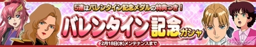 バレンタイン記念ガシャは、「SR リィナ・アーシタ」や「SR ラクス・クライン」など、新規女性サポートカードが12枚追加された特別なガシャで、5連ガシャには特典として記念メダルが付く。