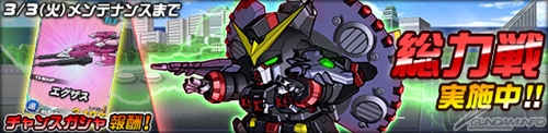同機を倒した際に引くことができるチャンスガシャには「★3 エグザス」を獲得できるチャンスがあるほか、エースユニットガシャには「デストロイガンダム(MS)」に対し3倍の攻撃力を発揮する「★2 レジェンドガンダム」が追加される。